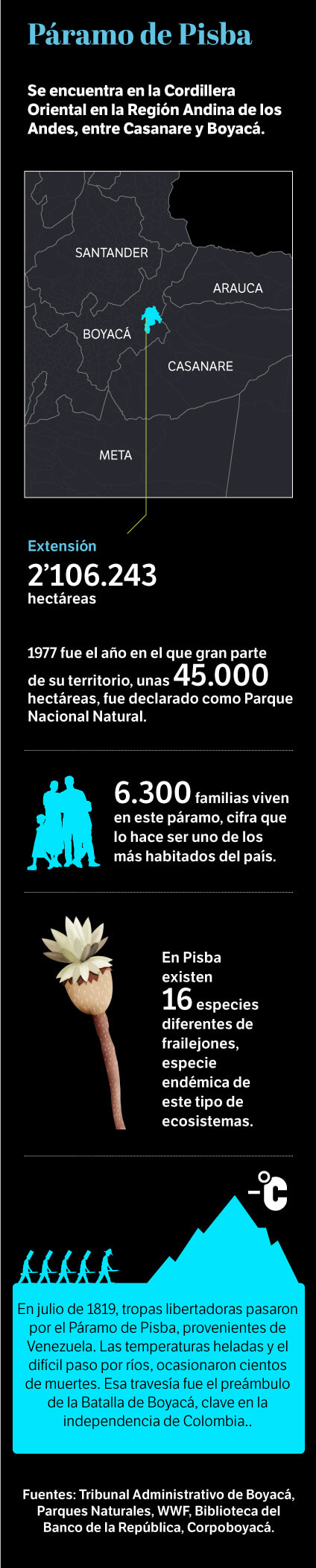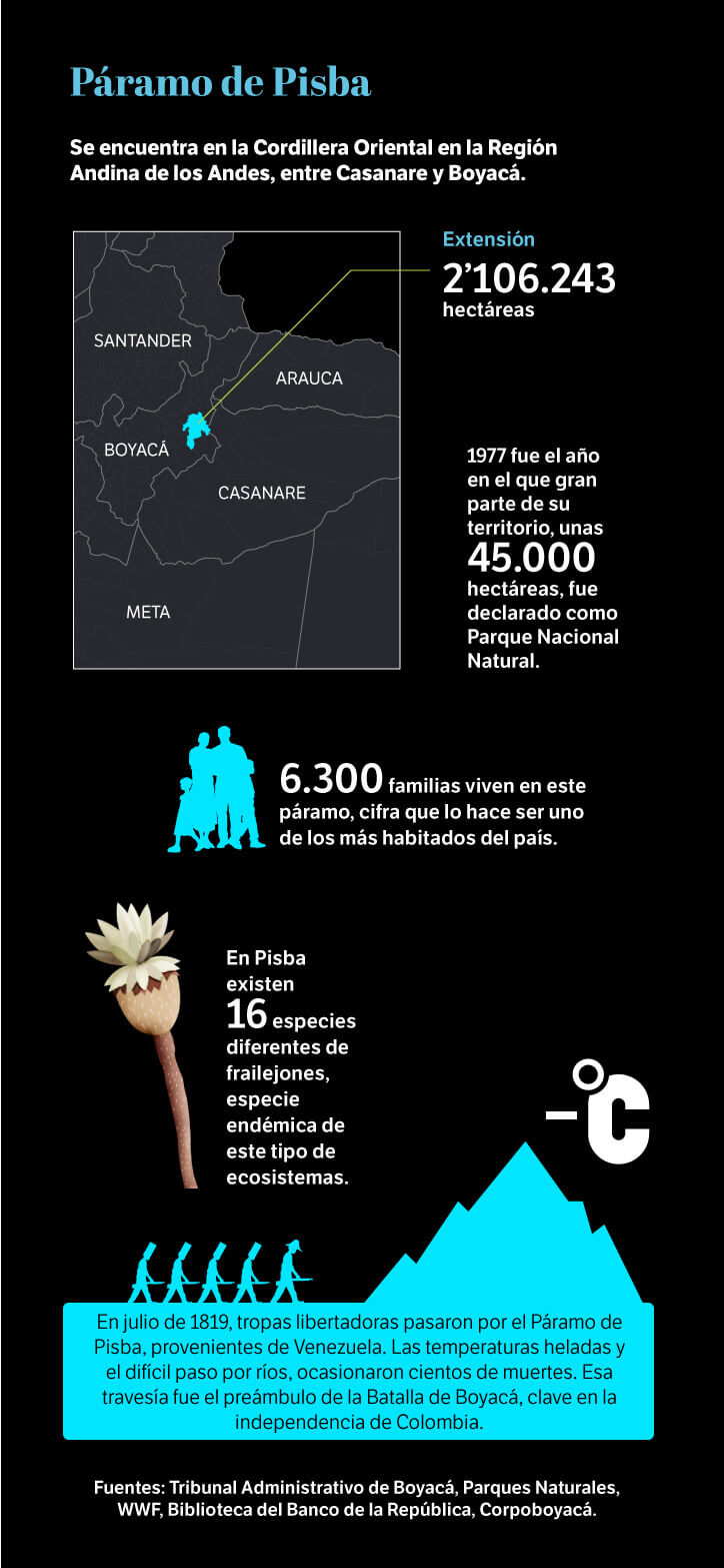 Sin sentencia, sin delimitación y sin una solución para el problema minero, pero con la explotación vigente, el páramo de Pisba sobrevive como puede. Tiene a unos vigías, como Pedro Abel Castañeda o Edilma Chía. Ellos, que con honor dicen ser campesinos, siguen al pie del páramo pues son quienes, de primera mano, viven los estragos de su desprotección: no hay agua en las quebradas, las heladas queman sus cultivos y el calentamiento global les ha trastocado todos los procesos de la tierra. Ellos, más que nadie, saben que esos problemas los ha causado el hombre, una realidad que hasta agosto de este año despejó de dudas el Panel Intergubernamental del Cambio Climático (IPCC), compuesto por 243 científicos de todo el mundo.