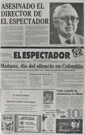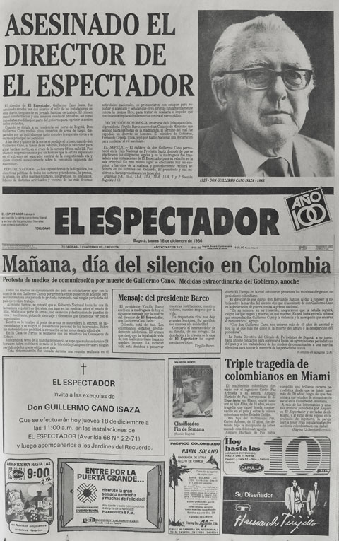 El miércoles 17 de diciembre de 1986, cuando salía del periódico que dirigía desde 1952, fue asesinado por el narcotráfico el director de El Espectador, Guillermo Cano Isaza. “Yo salgo del periódico por las noches, y no sé qué va a pasar” fueron las palabras premonitorias de su última entrevista concedida a Cecilia Orozco. El periodista Guillermo Cano lideraba una cruzada personal y profesional contra los carteles del narcotráfico. El 19 de diciembre, en protesta contra el asesinato, tuvo lugar en Bogotá la denominada Marcha del Silencio. Además, no circularon periódicos, ni la televisión, ni la radio emitieron señales en homenaje a la memoria del periodista.